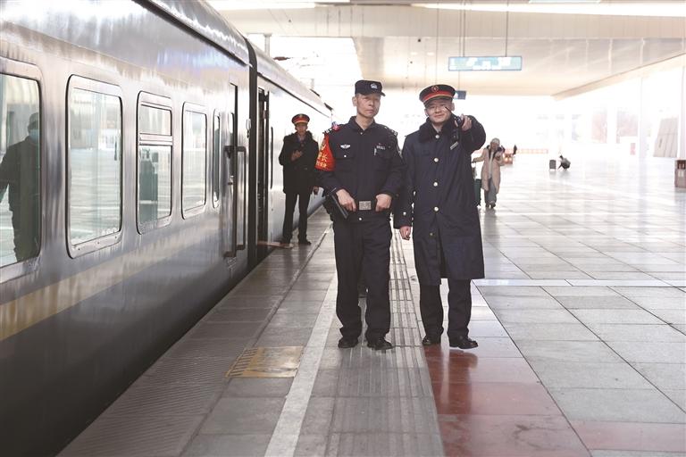 列車出發(fā)前,左紅彬(左)在站臺進行安全檢查。通訊員 黃飛 攝