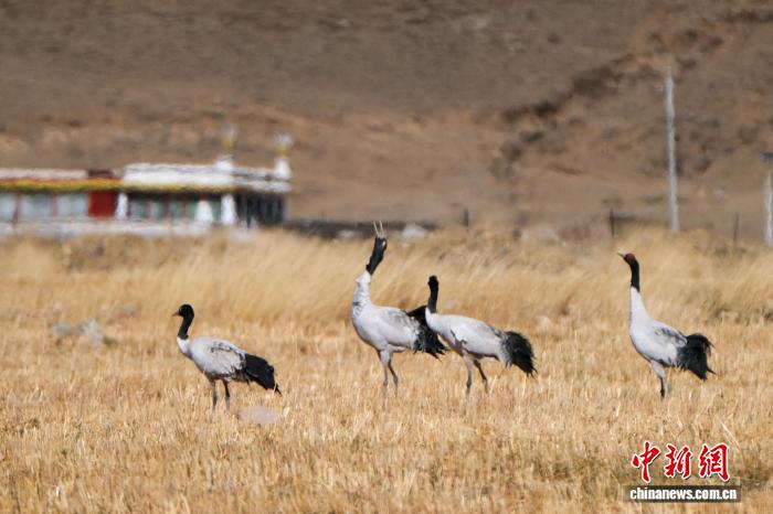 黑頸鶴是中國國家一級保護(hù)動物,是唯一生活、繁殖在高原的鶴類,被藏族民眾譽(yù)為“吉祥鳥”。近日,西藏自治區(qū)拉薩市林周縣林業(yè)和草原局介紹,作為黑頸鶴重要的越冬棲息地,今年該縣境內(nèi)黑頸鶴數(shù)量在1800只至2300只之間,其中虎頭山水庫卡東村一帶占比約一半。中新網(wǎng)記者在周邊看到,不少黑頸鶴在田間覓食,不時飛翔于高原農(nóng)田、村落上空,舞動的鶴影和聲聲鶴鳴為冬春時節(jié)的高原增添了幾分靈動。圖為2月8日,黑頸鶴群在悠閑覓食。江飛波 攝