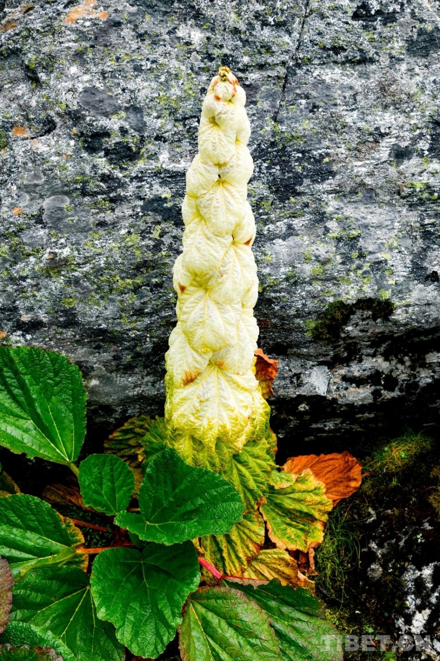 我們眼前這座高高的“黃塔”葉片,實(shí)則為這種植物開花后的模樣。未開花時(shí),它形似“略帶玫紅色的大白菜”,而開花時(shí)則抽出高達(dá)1-2米的花序,淡黃色苞片層疊如寶塔,在灰褐色的亂石中熠熠生輝。也正因此奇特外形,得名“塔黃”。
