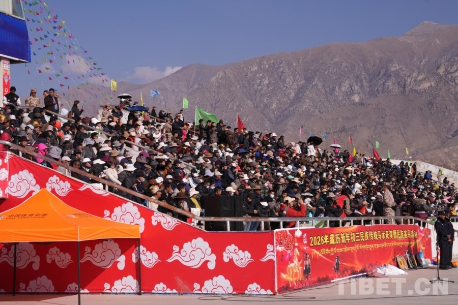 中國西藏網(wǎng)訊 2月20日,拉薩北郊賽馬場彩旗獵獵、人聲鼎沸。2026年藏歷新年初三民族傳統(tǒng)馬術(shù)表演暨民族賽馬活動正式拉開帷幕。