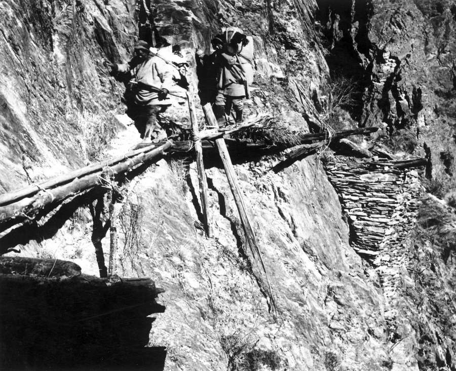 《農(nóng)奴們外出支差,在峭壁棧道上艱難地行走(1957年攝 )》 作者:陳宗烈