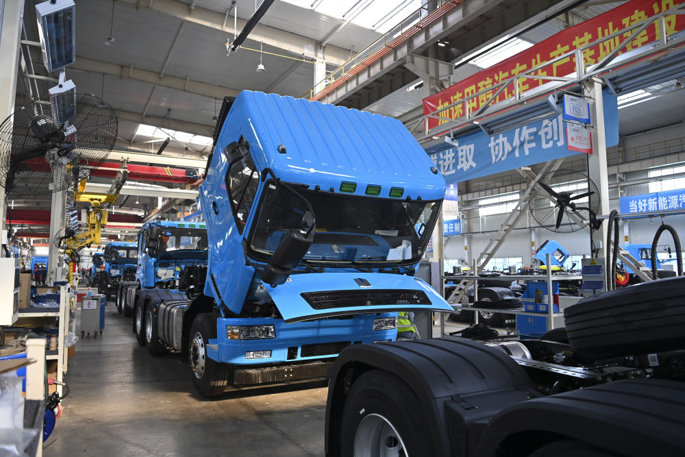 工作人員在位于山西省晉中市榆次區(qū)的山西新能源汽車工業(yè)有限公司(吉利晉中基地)生產(chǎn)甲醇重卡(4月1日攝)。新華社記者 楊晨光 攝