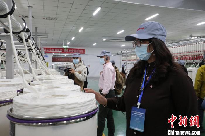 4月13日,外國(guó)媒體人參觀拍攝新疆尉犁縣利華紡織有限公司紡紗廠工作情況。 徐雪瑩 攝