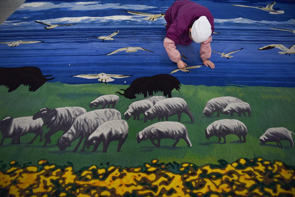 2023年2月21日,在西寧市圣源地毯集團(tuán)生產(chǎn)車(chē)間,操作工檢查毯面、拔花刺。新華社記者吳剛攝