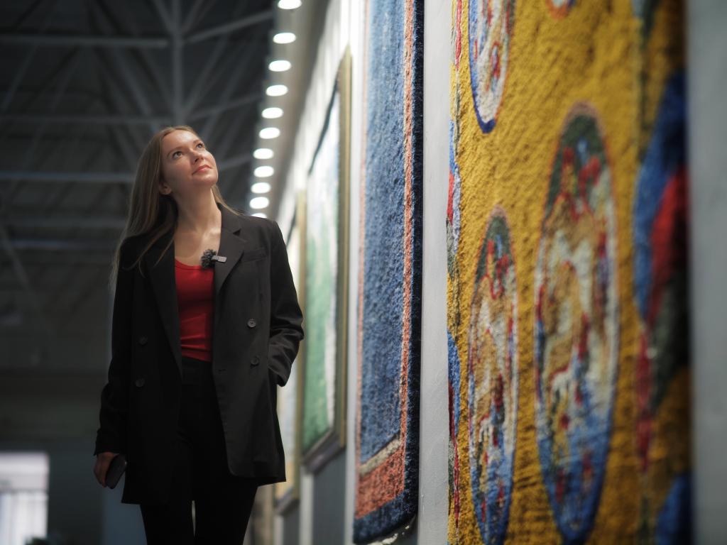 2024年3月20日,新華社外籍記者達(dá)莎在西寧市圣源地毯集團(tuán)生產(chǎn)車(chē)間參觀。新華社記者趙宇攝