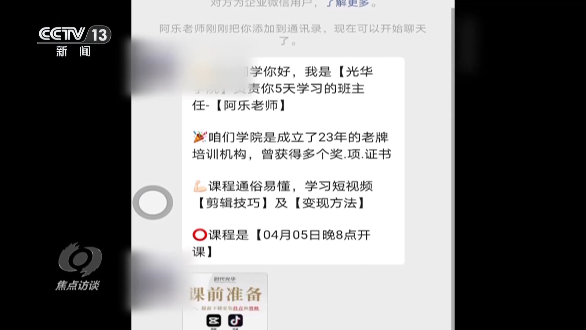 黃先生的遭遇并不是個案。記者瀏覽多個網(wǎng)絡(luò)平臺,發(fā)現(xiàn)類似的廣告比比皆是,五花八門,0元學(xué)配音、0元學(xué)書法、0元學(xué)易經(jīng)……記者隨機(jī)點開了一家賬號主體為北京時代光華科技有限公司的0元5天剪輯直播課,添加所謂的老師微信之后就被拉進(jìn)了一個微信群,4月5日晚上8點,課程開始了。