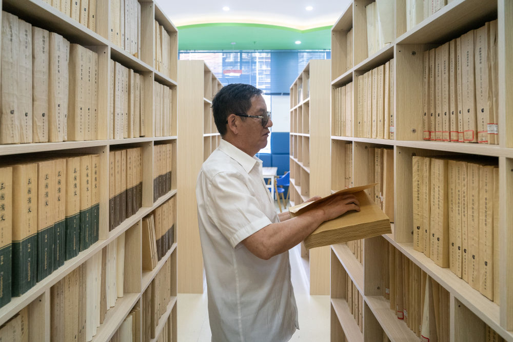 4月15日,昆明市盲啞學校教師彭斌在學校圖書室查找盲文書。(新華社記者 陳欣波 攝)
