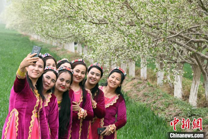 4月15日,新疆伽師縣舉行第四屆新梅花開(kāi)文學(xué)藝術(shù)采風(fēng)活動(dòng)。圖為新疆伽師縣米夏鄉(xiāng)的民眾在新梅花前自拍。中新網(wǎng)記者孫亭文攝