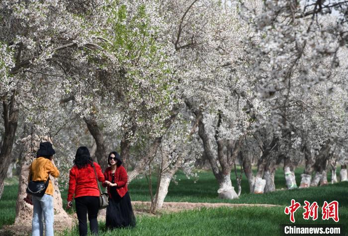 3月31日,多名游客在新疆阿克陶縣塔爾塔吉克民族鄉(xiāng)巴格艾格孜村的杏花樹(shù)下拍照。中新網(wǎng)記者孫亭文攝