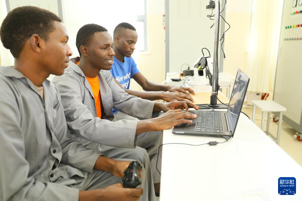 2023年11月18日,在盧旺達(dá)北方省穆桑澤職業(yè)技術(shù)學(xué)院魯班工坊的實(shí)驗(yàn)室中,兩名當(dāng)?shù)貙W(xué)生操作儀器。新華社發(fā)(黃萬(wàn)晴攝)