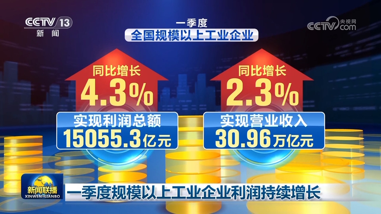 一季度,全國(guó)規(guī)模以上工業(yè)企業(yè)實(shí)現(xiàn)利潤(rùn)總額15055.3億元,同比增長(zhǎng)4.3%,實(shí)現(xiàn)營(yíng)業(yè)收入30.96萬億元,同比增長(zhǎng)2.3%,工業(yè)企業(yè)利潤(rùn)保持增長(zhǎng),工業(yè)企業(yè)營(yíng)收繼續(xù)恢復(fù)。