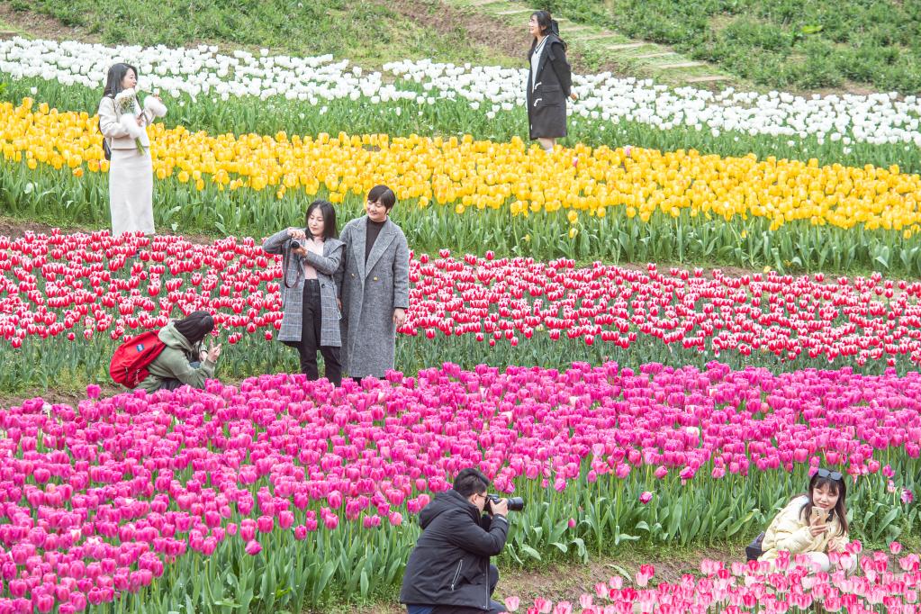 3月9日,在位于重慶市長壽區(qū)的長壽湖景區(qū),游客在郁金香花海中賞花拍照。景區(qū)今年一共從荷蘭進(jìn)口郁金香種球近60萬粒,分三大系列27個品種,種植面積約12000平米。新華社記者唐奕攝