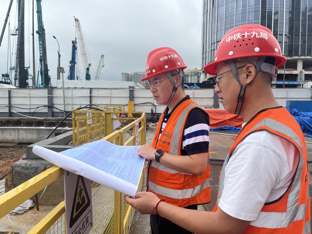2024年4月26日,深圳市五一勞動獎?wù)芦@得者、中鐵十九局軌道公司項(xiàng)目副經(jīng)理夏荔(左)在穗莞深城際鐵路前皇段皇崗口岸站建設(shè)現(xiàn)場忙碌。新華社發(fā)
