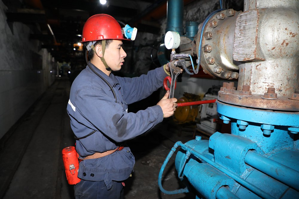 2024年4月30日,冀中能源峰峰集團(tuán)新屯礦機(jī)電區(qū)副區(qū)長顧博在井下泵房檢修水泵。新華社發(fā)