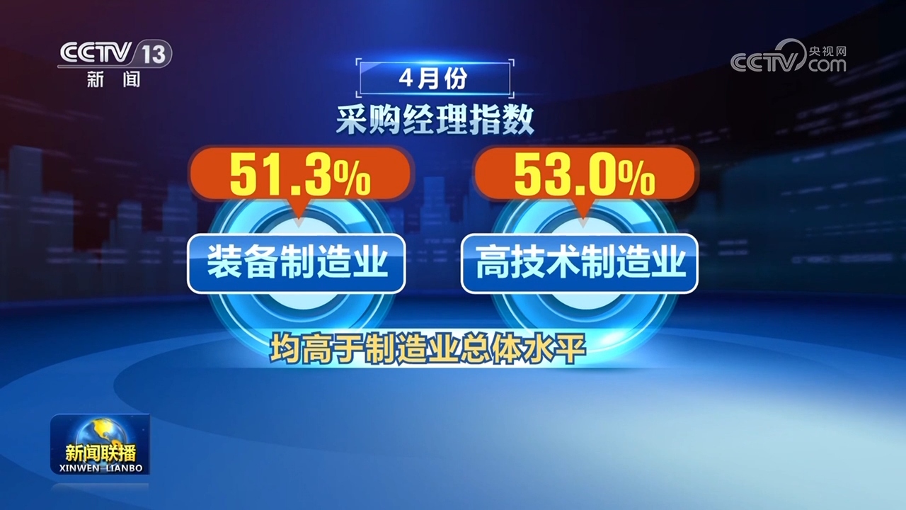 新動能繼續(xù)較快擴張。4月份裝備制造業(yè)和高技術制造業(yè)采購經(jīng)理指數(shù)分別為51.3%和53.0%,均高于制造業(yè)總體水平。