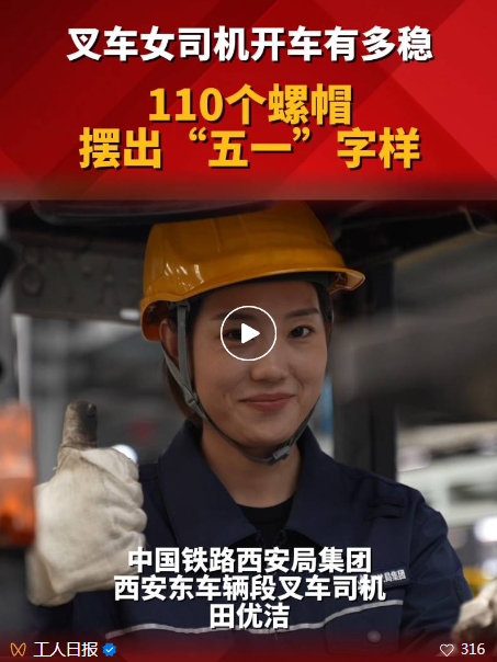 “95后”姑娘田優(yōu)潔是中國鐵路西安局集團有限公司西安東車輛段的一名叉車司機,平時的主要工作就是駕駛叉車完成車鉤的裝卸作業(yè)。“五一”國際勞動節(jié)之際,田優(yōu)潔開著叉車用110個螺帽擺出了“五一”字樣,這技術(shù),真的穩(wěn)!