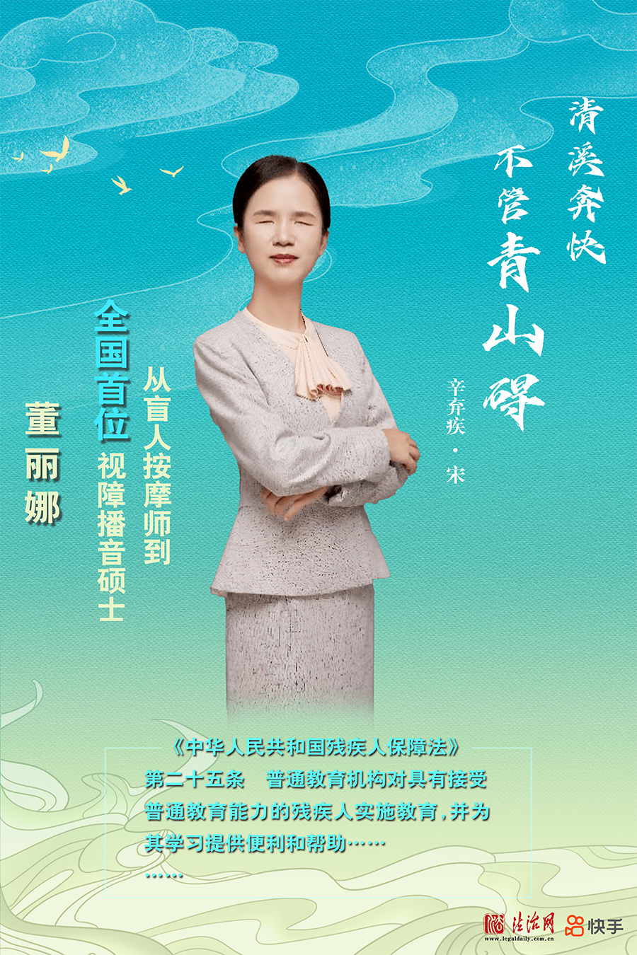 董麗娜先天弱視,10歲失明。但她自強(qiáng)不息、排除萬難,在22歲時(shí)爭取到視障人士播音培訓(xùn)機(jī)會,獲得一級甲等普通話證書,成為《麗娜品讀時(shí)間》的主持人。2020年考入中國傳媒大學(xué)攻讀碩士學(xué)位,2023年畢業(yè)成為全國首位視障播音碩士。