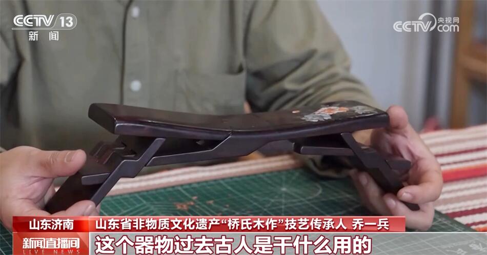 山東省非物質(zhì)文化遺產(chǎn)“橋氏木作”技藝傳承人喬一兵介紹:“它本身是一整塊木頭六個(gè)面,通過(guò)鋸和鑿形成一個(gè)器物。這個(gè)器物過(guò)去古人是干什么用的?當(dāng)枕頭用的,也可以當(dāng)?shù)首佑?,它最大的特點(diǎn)是可以折疊,攜帶非常方便,傳說(shuō)是魯班發(fā)明的。和眾多的優(yōu)秀的傳統(tǒng)技藝一樣,它深層次代表的是中國(guó)的一些思想、一些哲學(xué)、一些文化在里邊,魯班枕的核心是平衡和和諧,我覺(jué)得我很有必要把它傳承下來(lái),發(fā)揚(yáng)光大。”