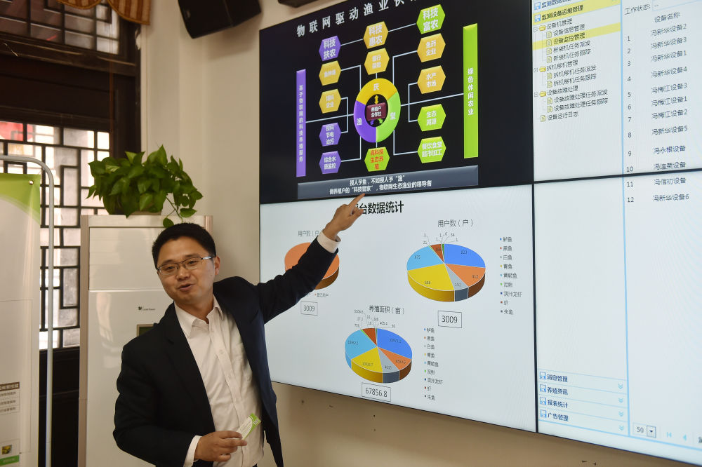 “漁博士”沈杰在浙江省湖州市菱湖鎮(zhèn)創(chuàng)辦的公司內(nèi)介紹匯集養(yǎng)殖戶、飼料廠商、銷售檔口、金融機構(gòu)等相關方的物聯(lián)網(wǎng)平臺(資料照片)。