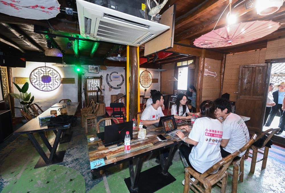 2023年8月11日,高校藝術院系的大學生們在寧波市寧??h葛家村的特色酒吧內(nèi)討論村落藝術改造提升的設計方案。 新華社記者 徐昱 攝