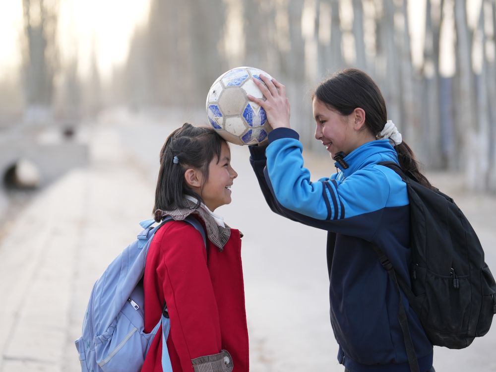 “我的紙飛機(jī)呀飛呀飛,飛到了蘆蕩邊。帶我去看落日晚霞,還有開滿花的田野……”姐妹倆給水指導(dǎo)唱了她們學(xué)過的歌。水指導(dǎo)給她們送了嶄新的足球,勉勵她們要好好踢球,也要好好學(xué)習(xí)。