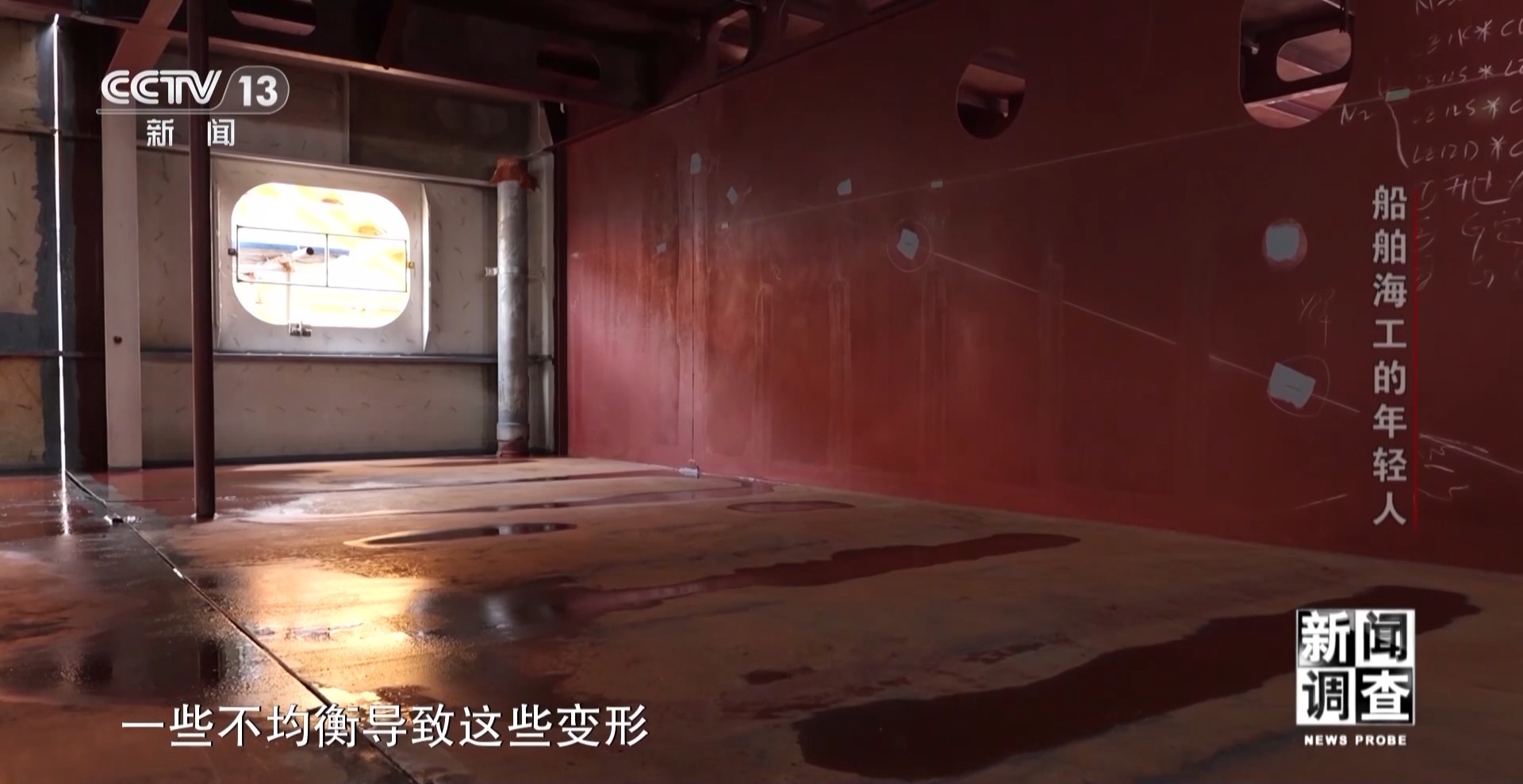 上海外高橋造船有限公司精度技術部副部長 孫建志:這個總段是典型的薄板結(jié)構,不平程度在正負15毫米之內(nèi)。所有的變形都是熱的影響,熱輸入以后就會產(chǎn)生殘余應力,一些不均衡導致這些變形。尤其是薄板結(jié)構更明顯,現(xiàn)在2號船的整體的平整度應該相對1號船已經(jīng)好很多了。