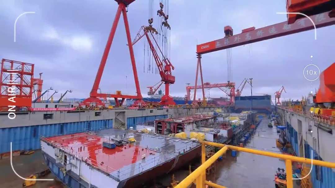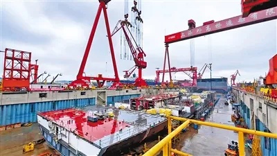 兩臺(tái)龍門吊緩緩起降,有序吊裝船體部件——中國船舶集團(tuán)上海外高橋造船2號(hào)船塢,第二艘國產(chǎn)大型郵輪不久前在這里迎來下塢搭載總裝節(jié)點(diǎn)。