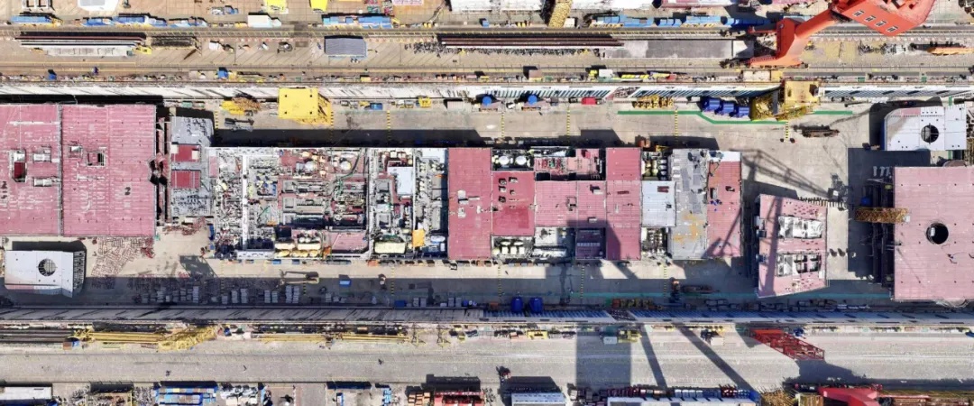俯瞰第二艘國產(chǎn)大型郵輪搭載總裝現(xiàn)場(chǎng)。陸佳駿 攝