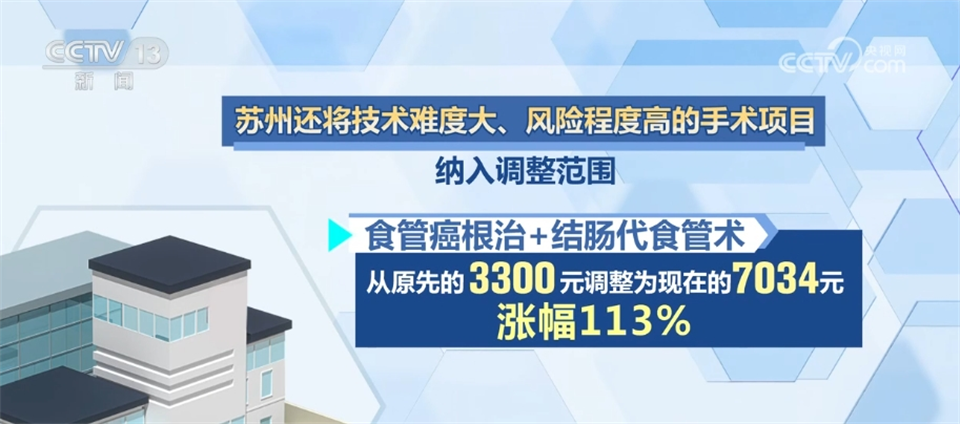 除了推進醫(yī)療機構分級定價,蘇州市醫(yī)療服務價格改革對一些歷史價格長期偏低,不能體現(xiàn)技術勞務價值的項目進行調整。如骨髓活檢術的醫(yī)療服務價格由過去的65元調整為124元,漲幅91%;斷指再植術由過去的1800元調整為3275元,漲幅82%。此外,蘇州還將技術難度大、風險程度高的手術項目納入調整范圍,調整的手術項目占比約60%,并對四級手術優(yōu)先調整,共調整四級手術項目110項,占比約13%。如食管癌根治+結腸代食管術,從原先的3300元調整為現(xiàn)在的7034元,漲幅113%。調整后,醫(yī)保仍按甲類項目全額報銷,上漲費用全部由醫(yī)?;鹬Ц叮颊叩膫€人負擔沒有增加多少。