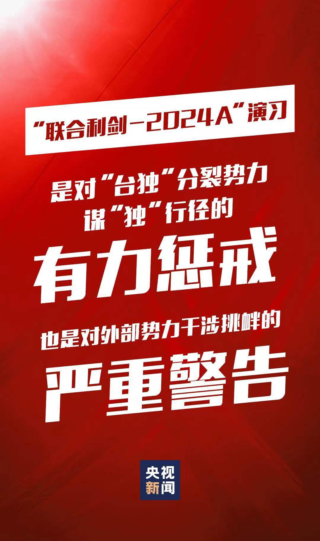 5月23日至24日,中國人民解放軍東部戰(zhàn)區(qū)組織戰(zhàn)區(qū)陸軍、海軍、空軍、火箭軍等兵力,位臺島周邊開展“聯(lián)合利劍-2024A”演習(xí),重點演練聯(lián)合海空戰(zhàn)備警巡、聯(lián)合奪取戰(zhàn)場綜合控制權(quán)、聯(lián)合精打要害目標(biāo)等科目,艦機(jī)抵近臺島周邊戰(zhàn)巡,島鏈內(nèi)外一體聯(lián)動,檢驗戰(zhàn)區(qū)部隊聯(lián)合作戰(zhàn)實戰(zhàn)能力。這是中國維護(hù)國家主權(quán)和領(lǐng)土完整的正義之舉,也是對“臺獨”分裂勢力謀“獨”行徑的有力懲戒,對外部勢力干涉挑釁的嚴(yán)重警告。