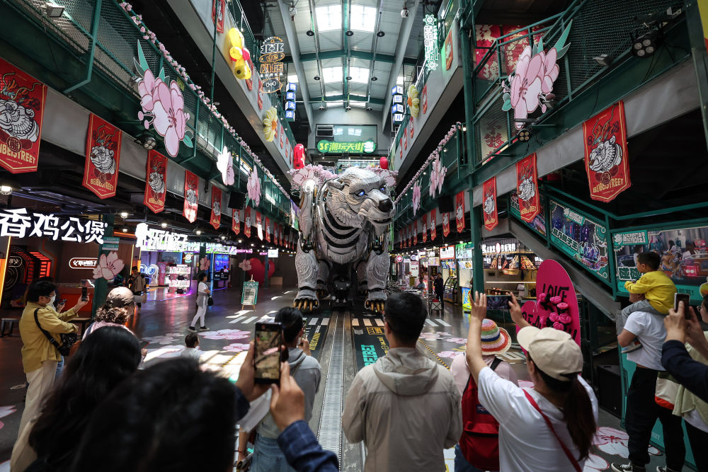 大連熊洞街,當身高6米、重達25噸,灰色的仿生機械巨熊時而張口咆哮,時而緩緩前行,游客爆發(fā)出陣陣歡呼。大連冰山慧谷發(fā)展有限公司總經理助理藍費靜說:“這一街區(qū)由擁有近百年歷史的大連冰山集團舊址改造而來,現(xiàn)已匯聚上百家游樂、電玩、研學商戶,老廠房煥發(fā)了新生機。”