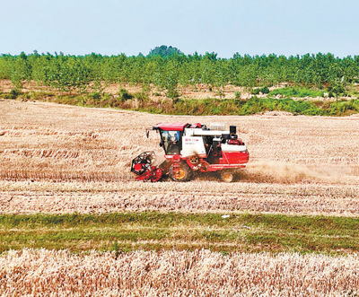 一片金黃的麥田里,撥禾輪轉(zhuǎn)動(dòng),麥芒飛揚(yáng),麥粒傾瀉而下……就在23日,蔡華從早忙到晚,沒敢停歇:“預(yù)報(bào)有雨,我得趕緊把客戶家的80多畝地收完?!碧烊谙聛?lái),他才把收割機(jī)停進(jìn)車棚,麥香味瞬間涌進(jìn)小院。累了一整天,剛吃完飯,蔡華又和妻子張秀蘭盤算起出發(fā)的行頭:對(duì)講機(jī)、收款二維碼……