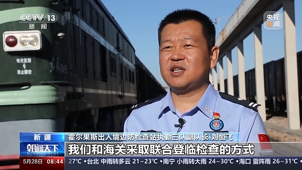 霍爾果斯出入境邊防檢查站執(zhí)勤三隊(duì)副隊(duì)長 劉恒飛:我們和海關(guān)采取聯(lián)合登臨檢查的方式對(duì)班列車體進(jìn)行檢查,查驗(yàn)出入境司乘人員和貨物基本是同步進(jìn)行,30分鐘內(nèi)即可完成查驗(yàn)。