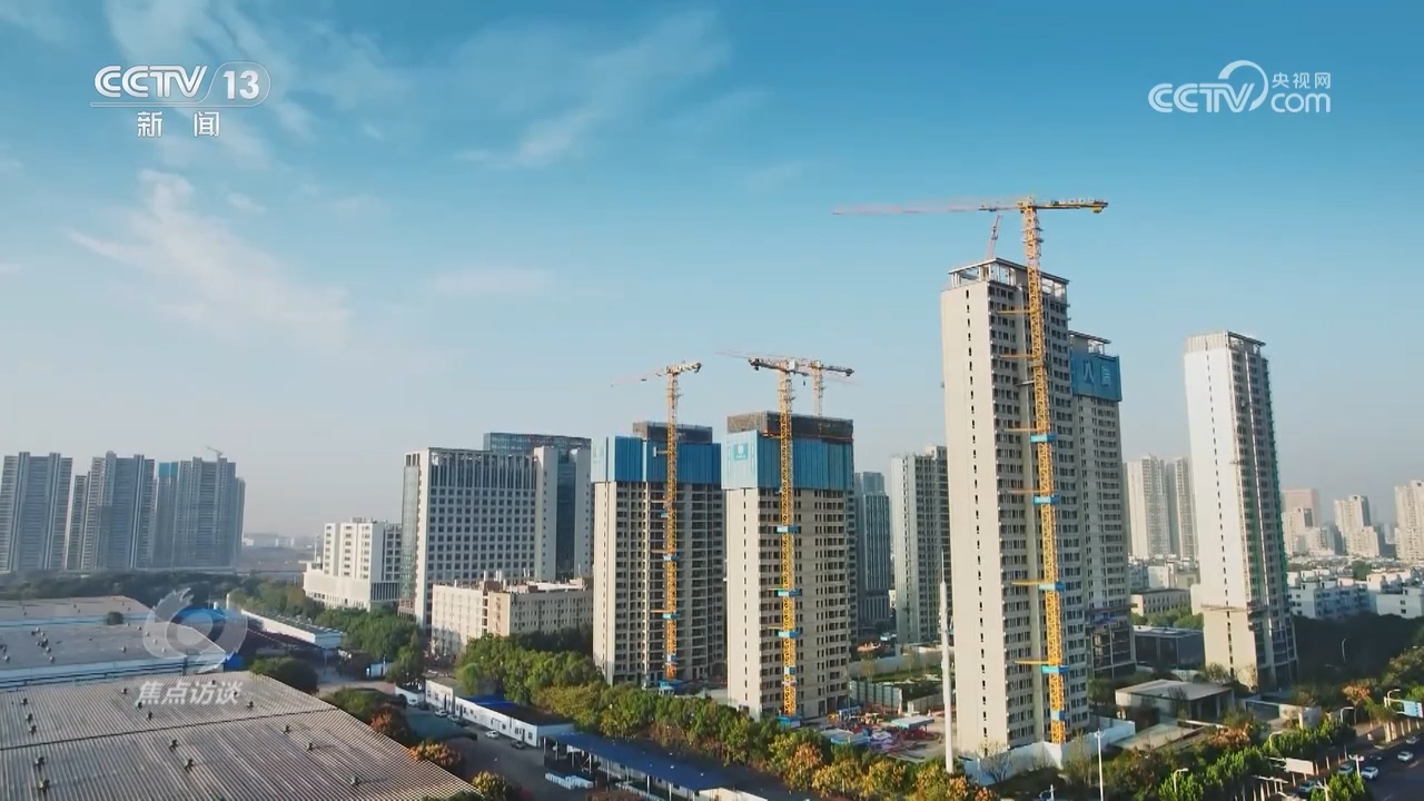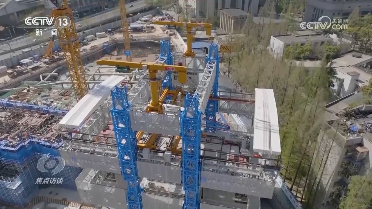 在湖北一家工廠,標準化施工構(gòu)件由工廠生產(chǎn)交付后,再由高空造樓機像拼積木一樣,將它們快速精準吊裝。這樣裝配式一體化的施工方式,能讓單棟樓的總工期節(jié)約近兩個月。