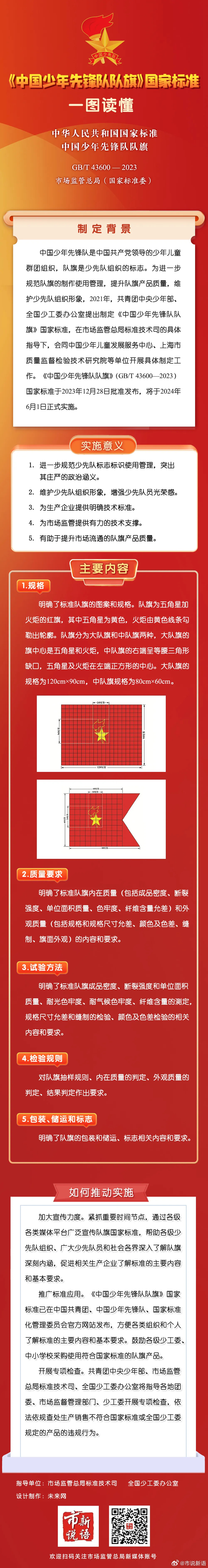 《中國少年先鋒隊隊旗》(GB/T 43600—2023)國家標(biāo)準(zhǔn)將于2024年6月1日正式實施。該標(biāo)準(zhǔn)由市場監(jiān)管總局(國家標(biāo)準(zhǔn)委)批準(zhǔn)發(fā)布,共青團中央、全國少工委會同相關(guān)單位編制。