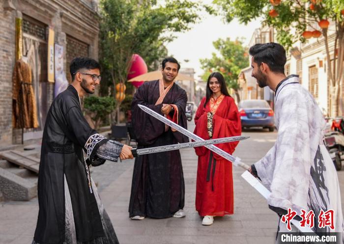 圖為邯森等4名巴基斯坦留學(xué)生在回車巷歷史文化街區(qū)穿漢服,感受中國(guó)傳統(tǒng)文化。王倩倩 攝