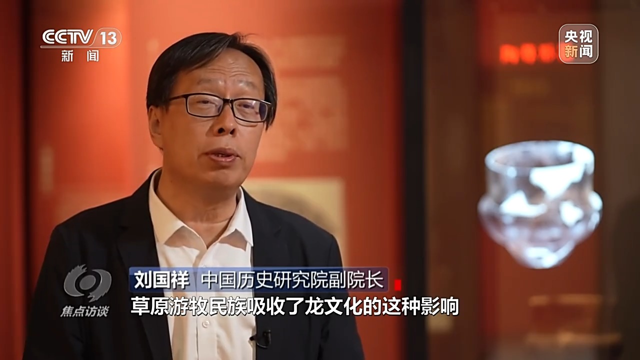 中國(guó)歷史研究院副院長(zhǎng) 劉國(guó)祥:展覽之中,我們發(fā)現(xiàn)了一件匈奴的王冠,上面是一只鳥(niǎo),下面一圈有虎、馬、龍,而且龍是草原龍的形象,草原游牧民族吸收了龍文化的影響。