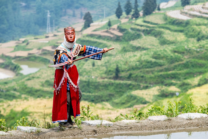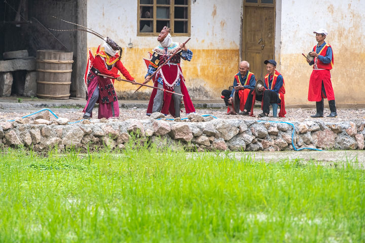 又是一年武陵山間水稻插秧季。在重慶市酉陽(yáng)土家族苗族自治縣銅鼓鎮(zhèn)清泉村,水稻田間時(shí)時(shí)回響著極具地方特色的戲曲唱段,一群特別的非遺技藝陽(yáng)戲(酉陽(yáng)土家面具陽(yáng)戲)表演者,往來于田間地頭。他們忙時(shí)翻土培秧,準(zhǔn)備著水稻插秧,閑時(shí)則舞槍弄?jiǎng)?,排演著表演劇目?/p>