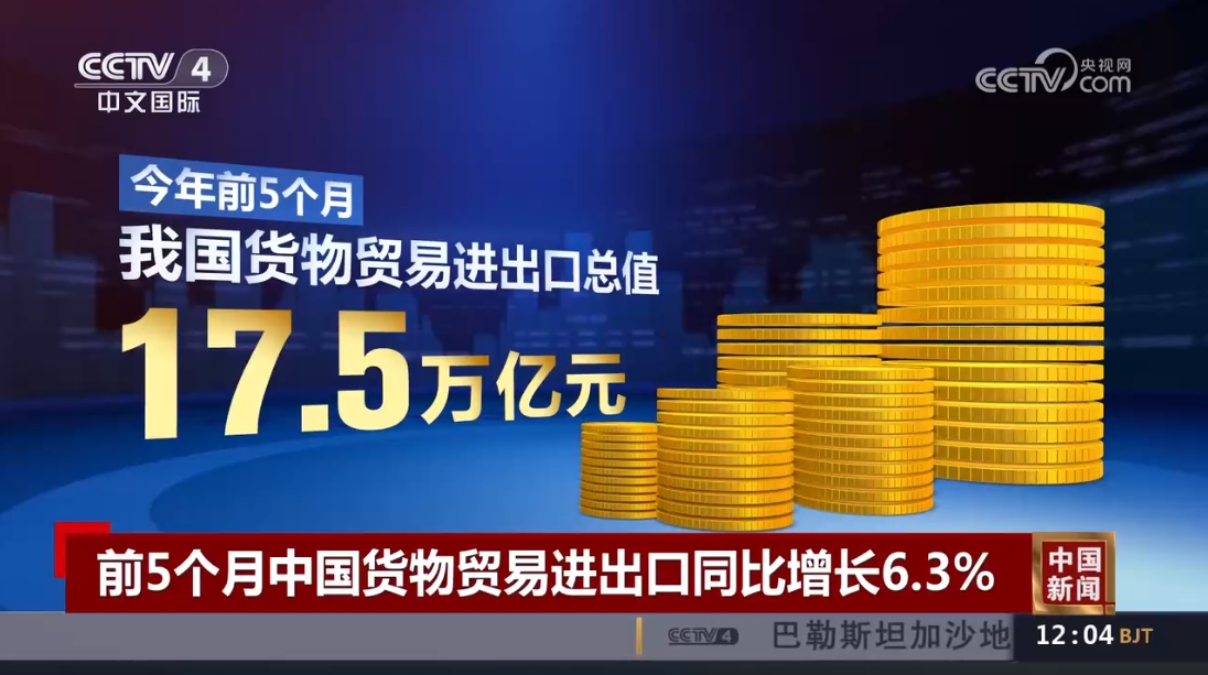 據(jù)海關(guān)統(tǒng)計,今年前5個月,我國貨物貿(mào)易進出口總值17.5萬億元,同比增長6.3%。其中,出口9.95萬億元,增長6.1%;進口7.55萬億元,增長6.4%。5月當(dāng)月,進出口3.71萬億元,同比增長8.6%。其中,出口2.15萬億元,增長11.2%;進口1.56萬億元,增長5.2%。