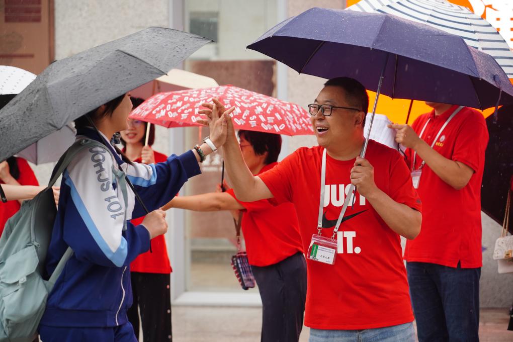 雖然天空下著雨,北京一零一中學(xué)的送考老師們還是早早在校門口排成一列,與陸續(xù)趕來(lái)的考生一一擊掌鼓勁。在校門口刷臉驗(yàn)證身份后,考生通過(guò)提前搭設(shè)的紅色晴雨走廊,步入候考區(qū)及考場(chǎng)。