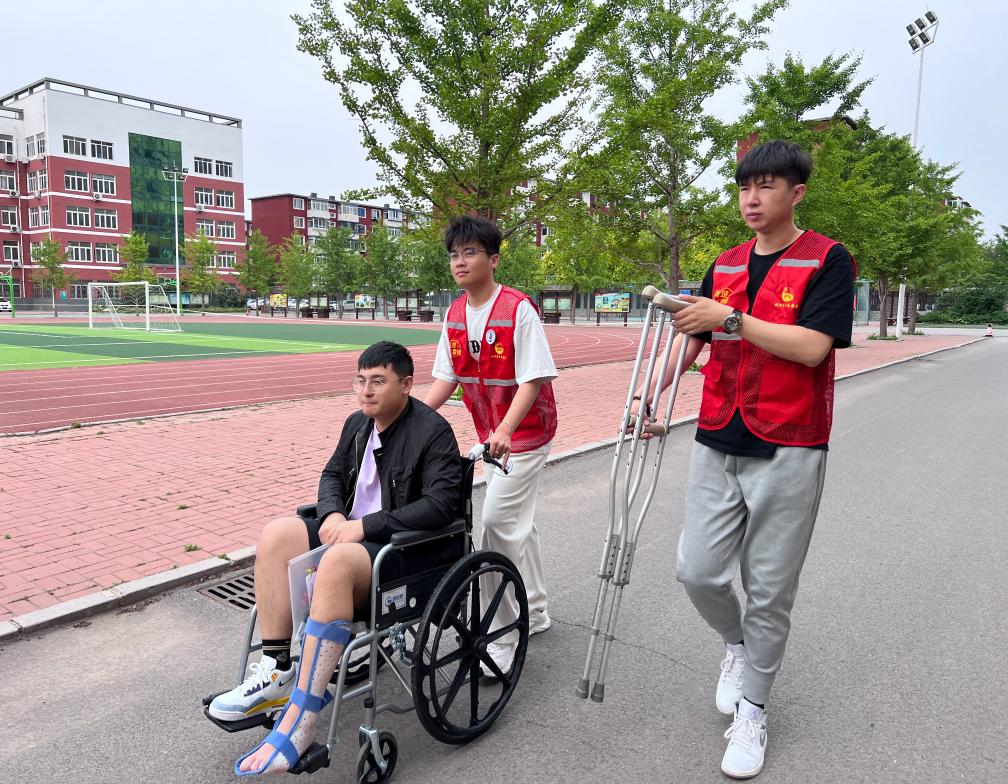 “我腳受傷了,行走不方便,你們能推我進(jìn)考場(chǎng)嗎?”“沒(méi)問(wèn)題!我們會(huì)全程陪你進(jìn)出考場(chǎng)?!鄙蜿?yáng)市第五十三中學(xué)考點(diǎn)門口,當(dāng)看到一位考生坐著輪椅行動(dòng)不便時(shí),志愿者們迅速承擔(dān)起了接送任務(wù)。