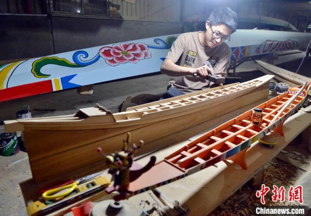 夜里,方莊龍舟制造技藝第四代傳人方劍偉正在制作“龍龍仔”。作為新一代龍舟技藝傳承人,近幾年他嘗試將龍舟做成模型進(jìn)行推廣。造型多樣的“龍龍仔”應(yīng)運而生,收獲不少龍舟愛好者的喜愛。中新社記者 張斌 攝