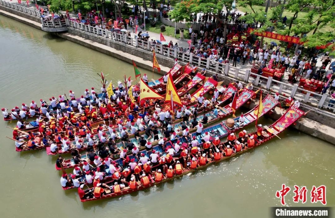2023年6月12日,莆田市“爬龍船”民俗賽事活動啟動儀式暨百艘龍舟齊聚黃石華江競渡盛會拉開帷幕。鑼鼓聲中,“龍船”齊發(fā),百舸爭流,岸上民眾歡呼聲不斷。中新社記者 吳晟煒