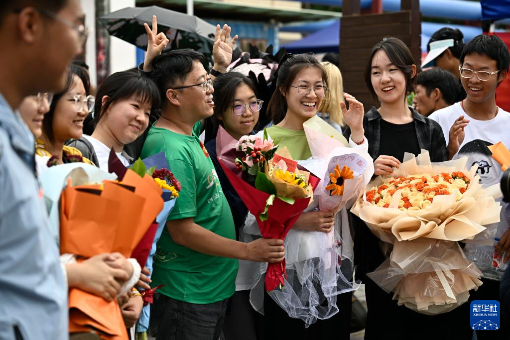 6月8日,在云南省昆明市第五中學(xué)考點(diǎn),考生手持鮮花慶??荚嚱Y(jié)束。新華社發(fā)(張正舉攝)