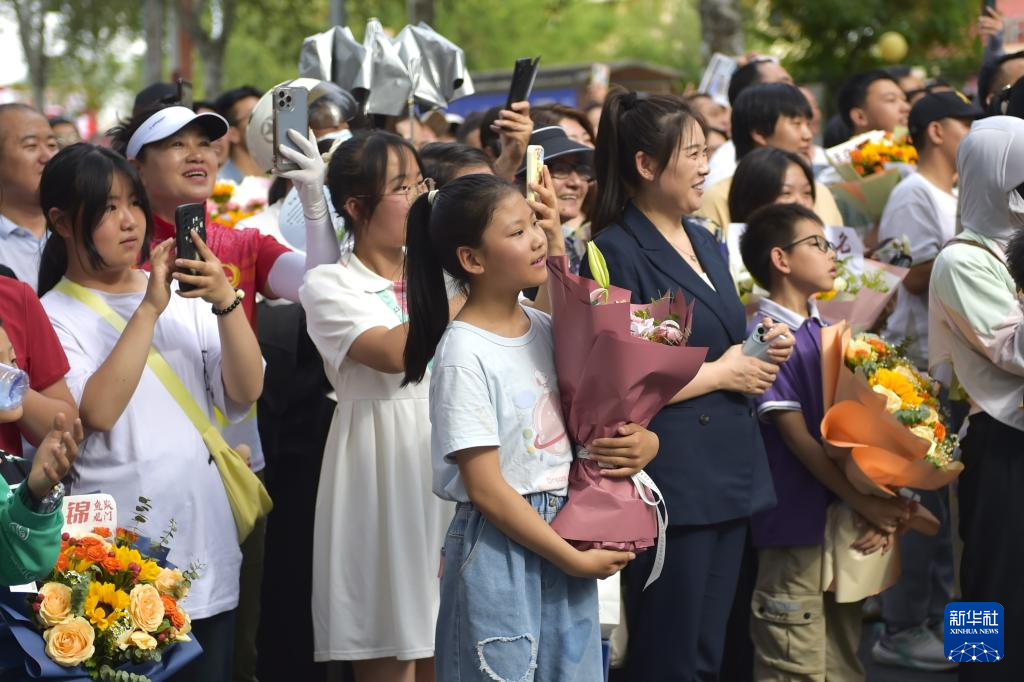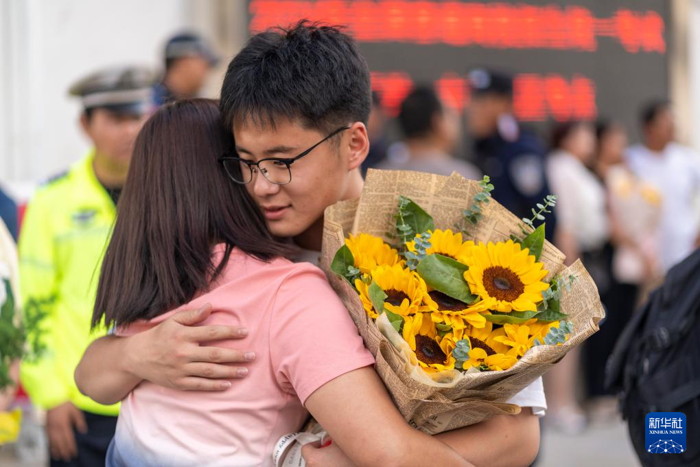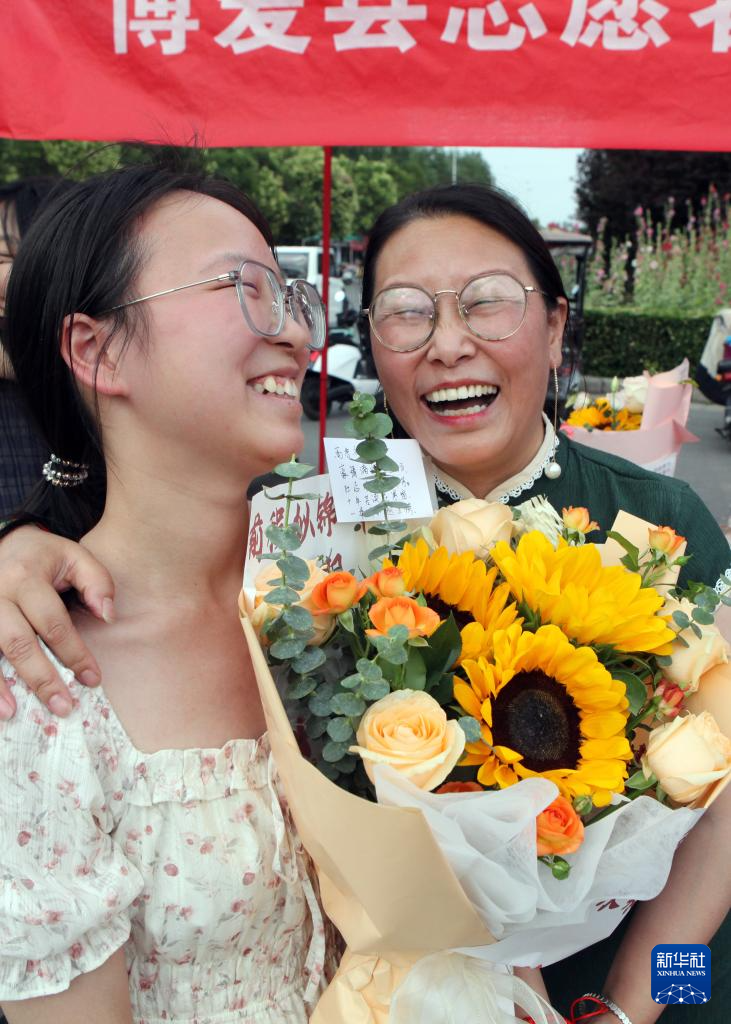 6月8日,在河南省焦作市博愛(ài)縣第一中學(xué)考點(diǎn),家長(zhǎng)為走出考場(chǎng)的孩子送上鮮花。新華社發(fā)(程全攝)