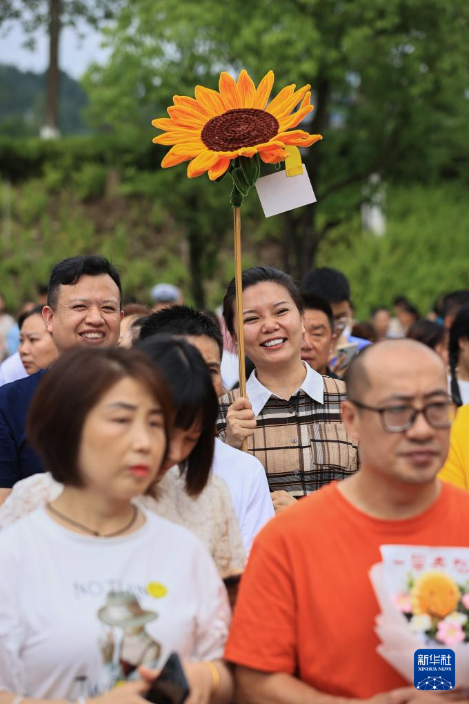 6月8日,在四川遂寧涪江中學(xué)考點(diǎn),家長(zhǎng)手拿寓意“一舉奪魁”的向日葵迎接考生。新華社發(fā)(劉昌松攝)