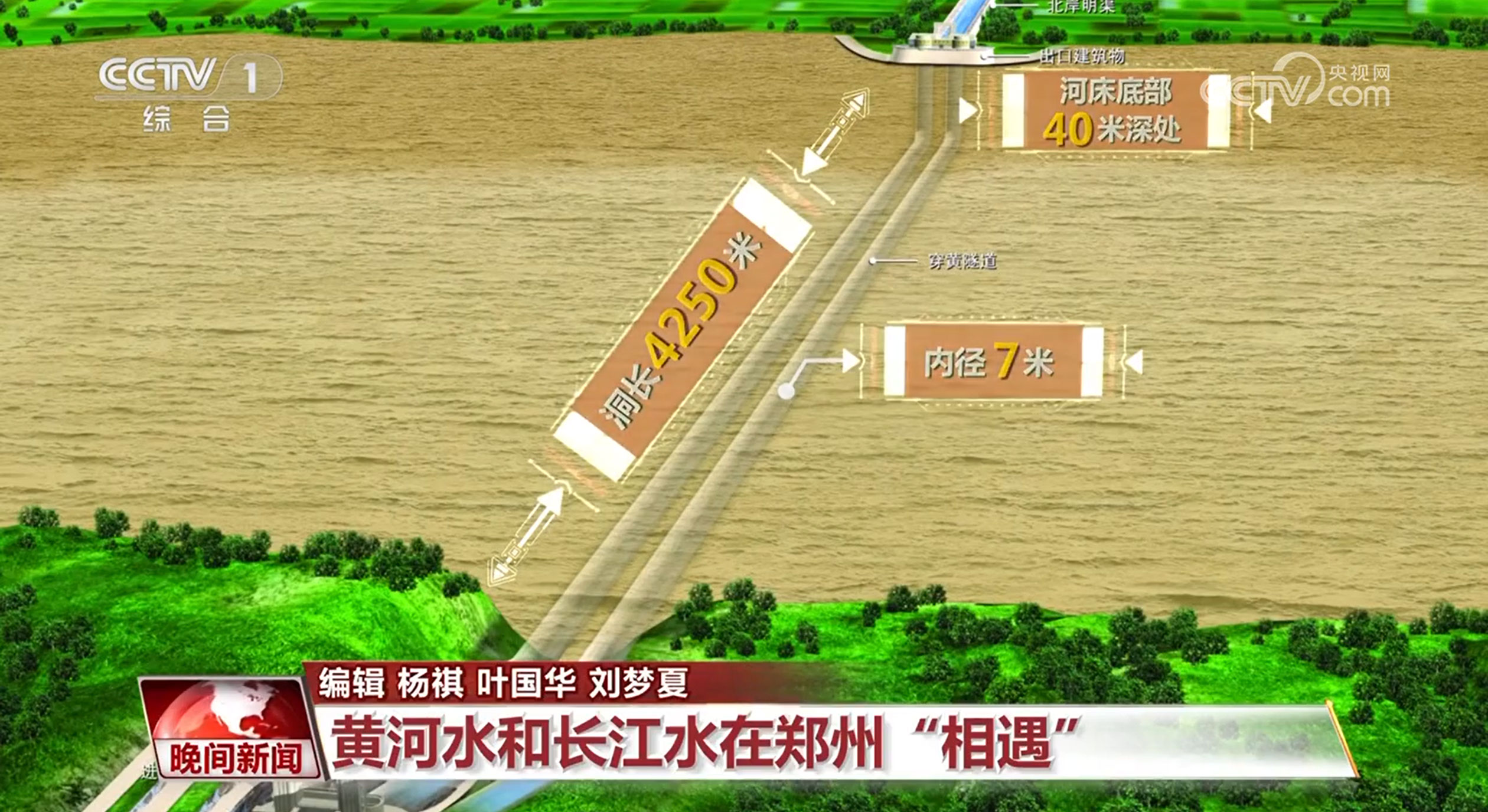 來自丹江口水庫的長江水自渠首出,一路自流向北,黃河成為阻礙南水北去的天然屏障。為了解決這個(gè)問題,“穿黃工程”由此誕生?!按S”顧名思義就是“穿越黃河”,黃河河床下復(fù)雜的地質(zhì)條件,注定了穿黃隧道不同于一般的交通隧道,也造就了隧道非同尋常的構(gòu)造。南水北調(diào)工程建設(shè)者在鄭州花園口西黃河河床底部40米深處開鑿兩條隧道,穿黃隧道為雙線有壓輸水隧道,單個(gè)洞長4250米,內(nèi)徑7米,這樣的內(nèi)徑可以滿足洞內(nèi)跑汽車。有了“穿黃工程”,北上的長江水通過兩條穿黃隧道與黃河立體交叉相遇,平時(shí),黃河水在上面流,南水北調(diào)的長江水在河底隧道中流過,兩者上下而過,猶如一條巨龍?jiān)邳S河之下隱去了身影。
