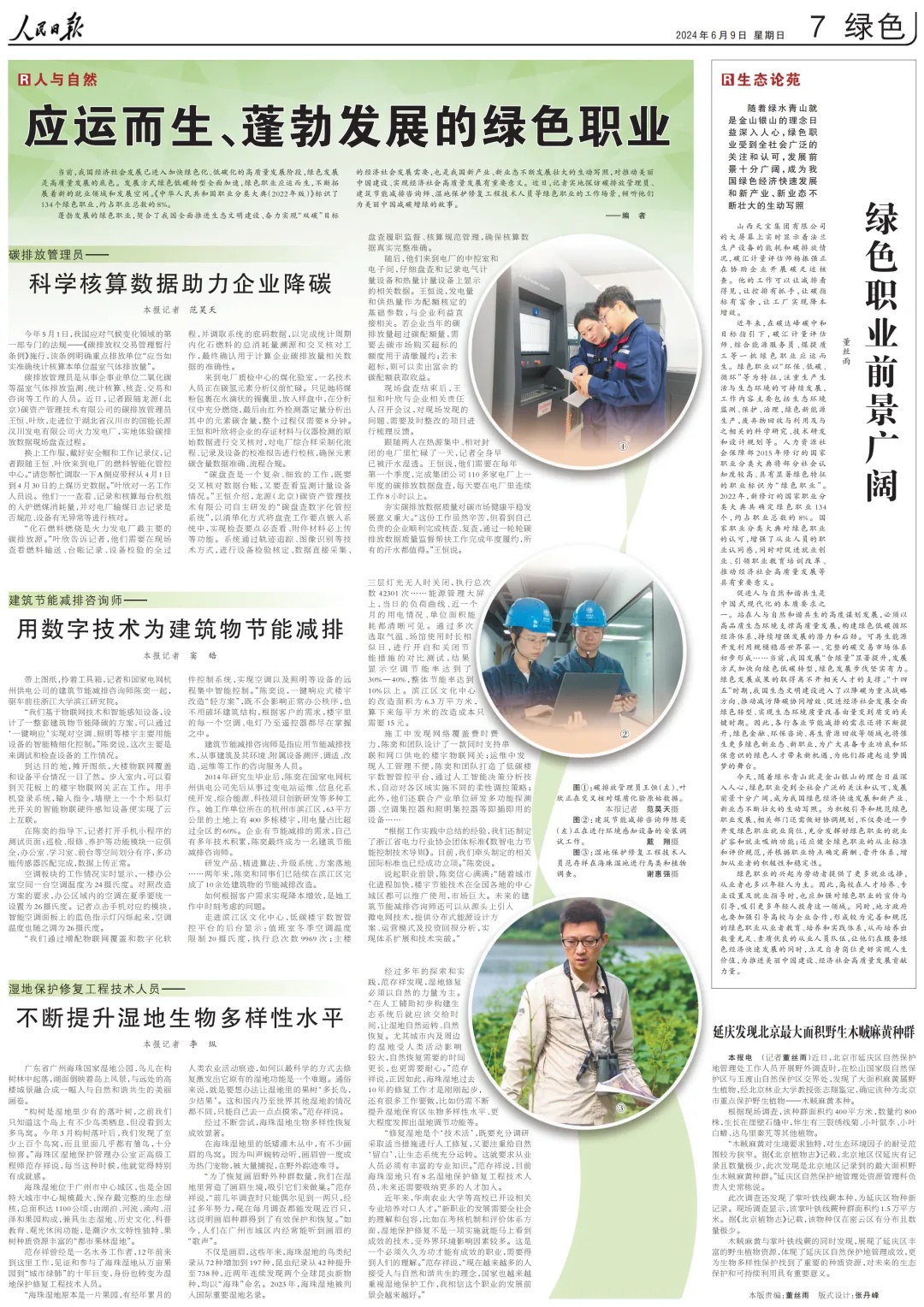 蓬勃發(fā)展的綠色職業(yè),契合了我國全面推進生態(tài)文明建設、奮力實現(xiàn)“雙碳”目標的經(jīng)濟社會發(fā)展需要,也是我國新產(chǎn)業(yè)、新業(yè)態(tài)不斷發(fā)展壯大的生動寫照,對推動美麗中國建設、實現(xiàn)經(jīng)濟社會高質(zhì)量發(fā)展有重要意義。近日,人民日報記者實地探訪碳排放管理員、建筑節(jié)能減排咨詢師、濕地保護修復工程技術(shù)人員等綠色職業(yè)的工作場景,傾聽他們?yōu)槊利愔袊鴾p碳增綠的故事。
