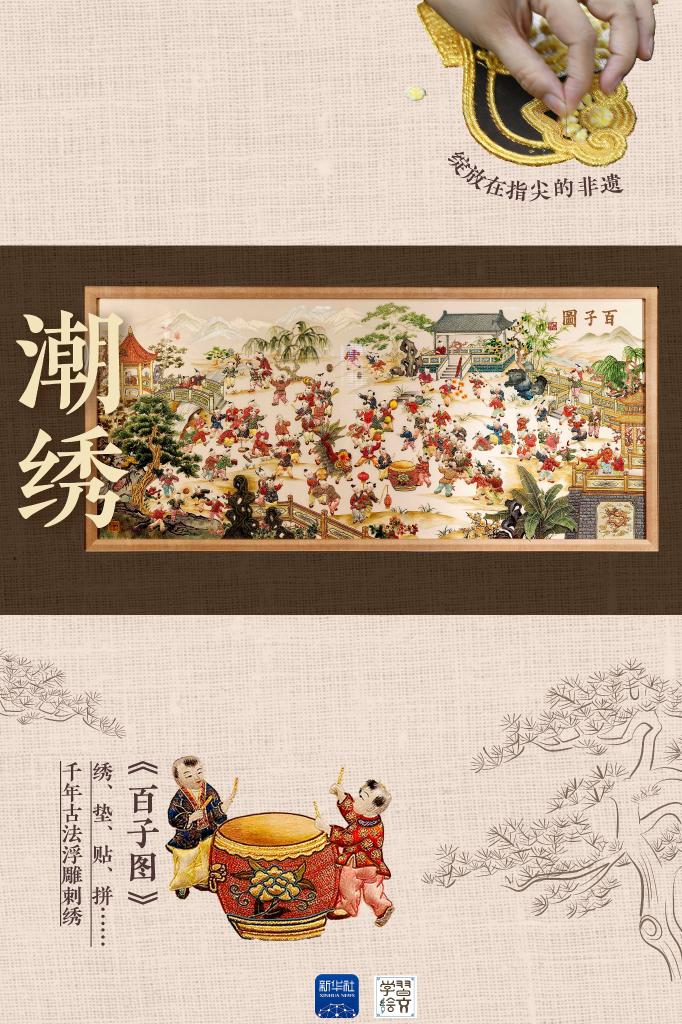 潮繡,屬我國(guó)四大名繡中的粵繡門(mén)派,最大的特點(diǎn)是立體墊高,以繡藝精美細(xì)致、構(gòu)圖均衡飽滿著稱,色彩亮麗又具立體感。