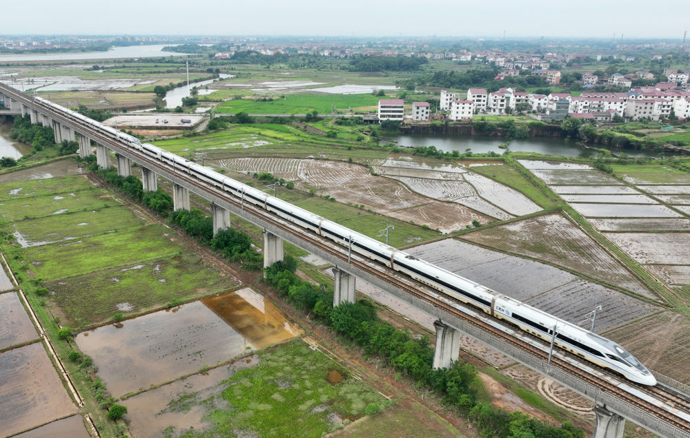 一輛高鐵列車從位于江西省鷹潭市的田野間駛過(無人機照片,6月4日攝)。新華社記者 萬象 攝